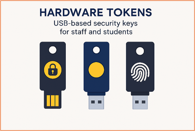 For staff and older students, USB-based hardware tokens offer a robust second factor without relying on mobile devices. These tokens are highly secure, resistant to phishing, and can be reused. Priced between $20–$50 per unit, they are a cost-effective solution for administrative access or remote login scenarios.